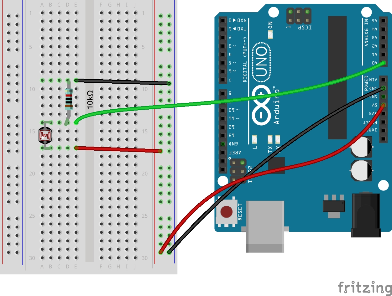 Conecta el extremo opuesto del sensor de luz a la pata A0 (o cualquier otra entrada analógica) del Arduino.